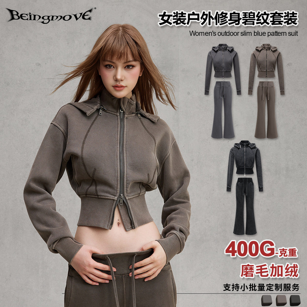 街头制燥复古水洗运动可拆卸开衫连帽卫衣户外微喇修身长裤套装女