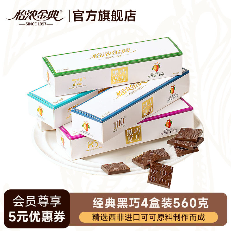 怡浓金典4盒黑巧克力纯可可脂100%排块苦巧烘焙零食生日礼物盒装