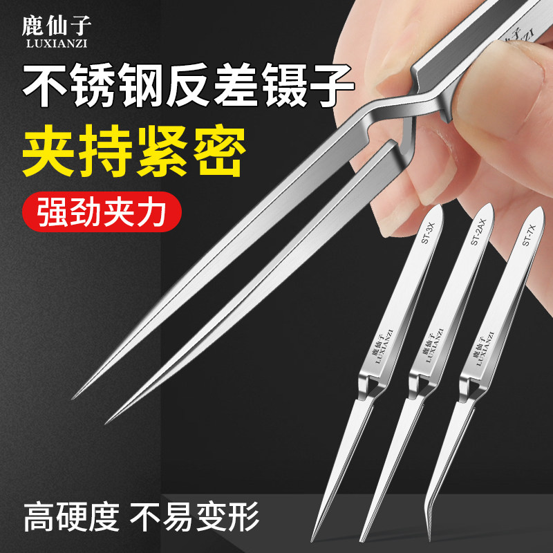 鹿仙子反向镊子手机维修高精密不锈钢夹子尖弯头圆头反差钳子工具