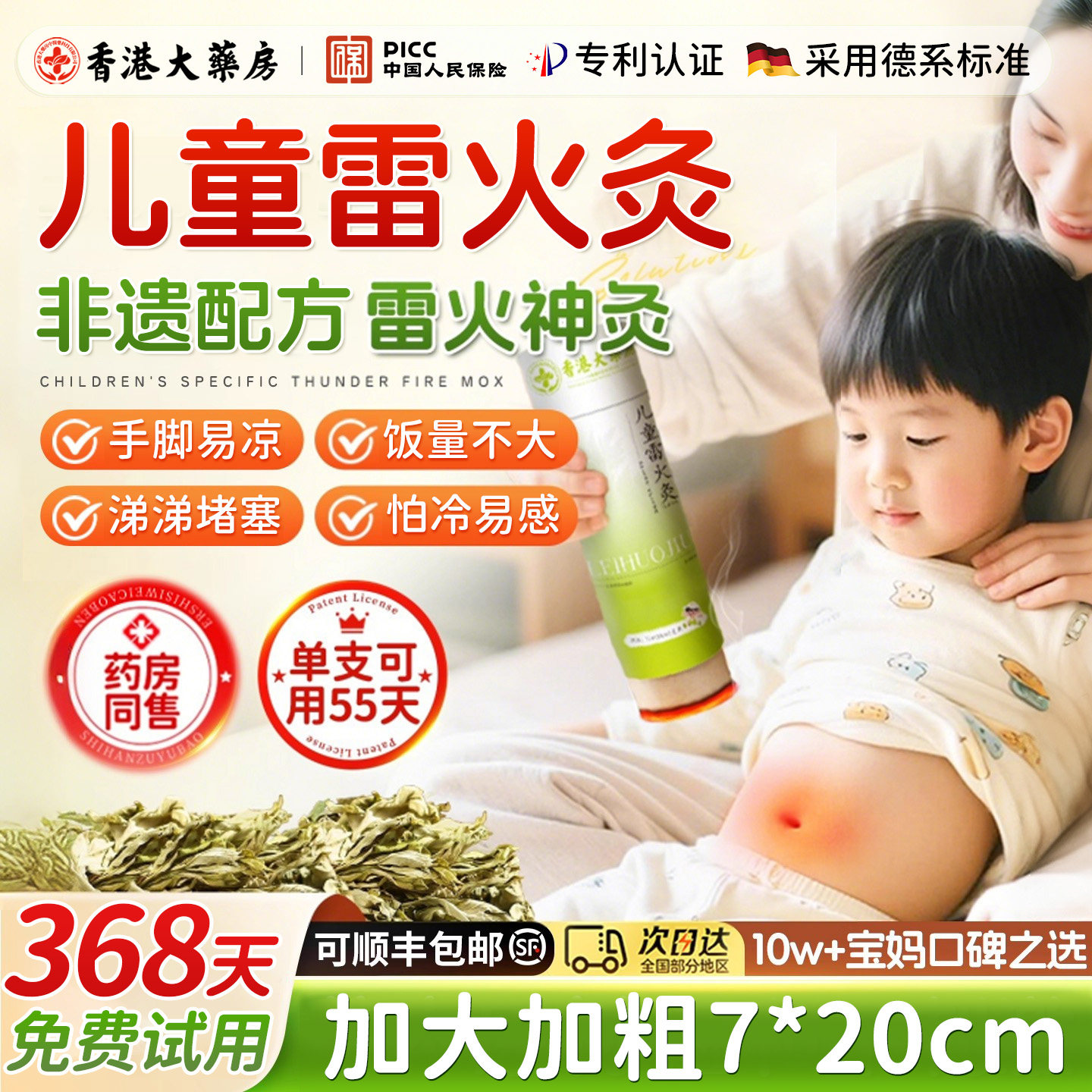 儿童雷火灸调理脾胃虚弱艾灸热敷腹部肚子陈艾宝宝小儿艾柱艾草条