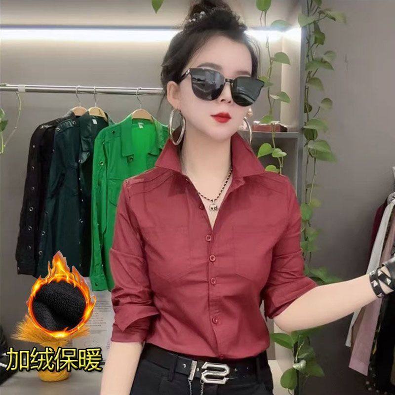 2025秋冬新款加绒加厚翻领纯棉长袖衬衫女职业通勤OL衬衣百搭上衣