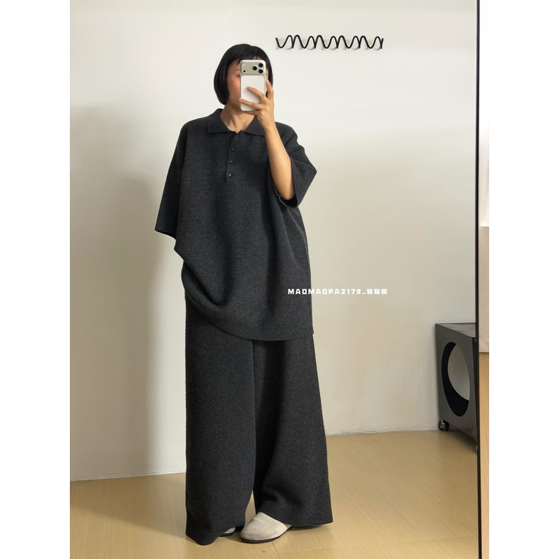 猫姐推荐|宽松翻领羊毛针织短袖毛衣+阔腿直筒羊毛针织裤套装女