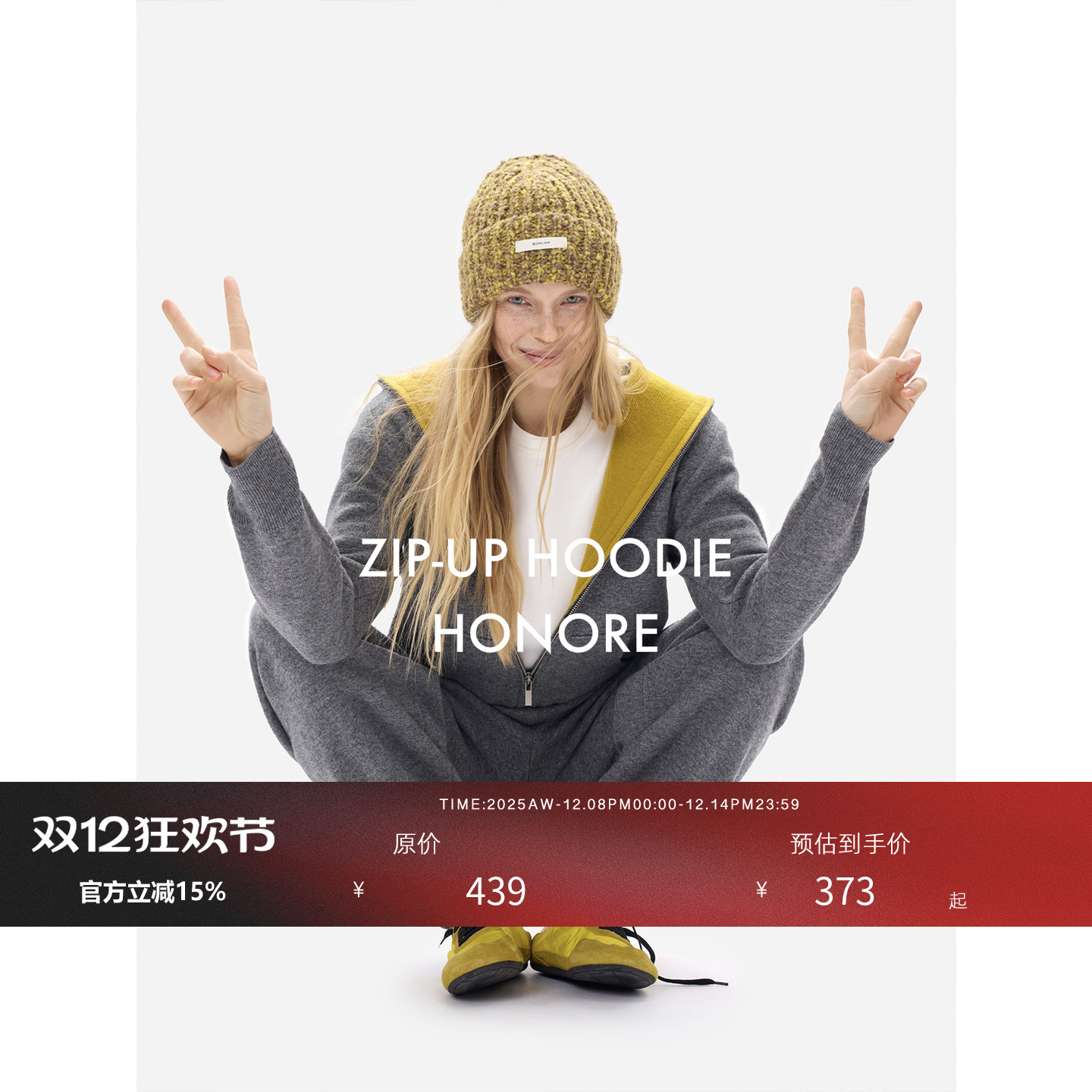 HONORE古月 羊毛针织百搭套装 撞色双拉链连帽外套+灯笼踩脚裤