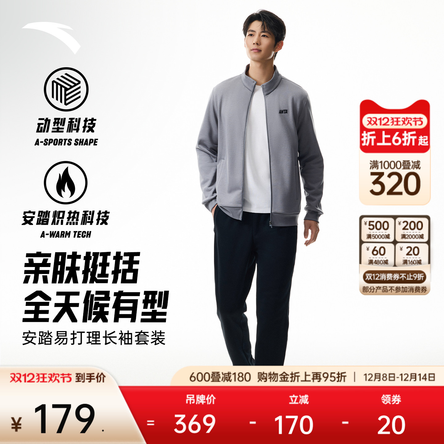 安踏易打理运动套装男士冬季新款立领针织外套上衣黑色长裤两件套