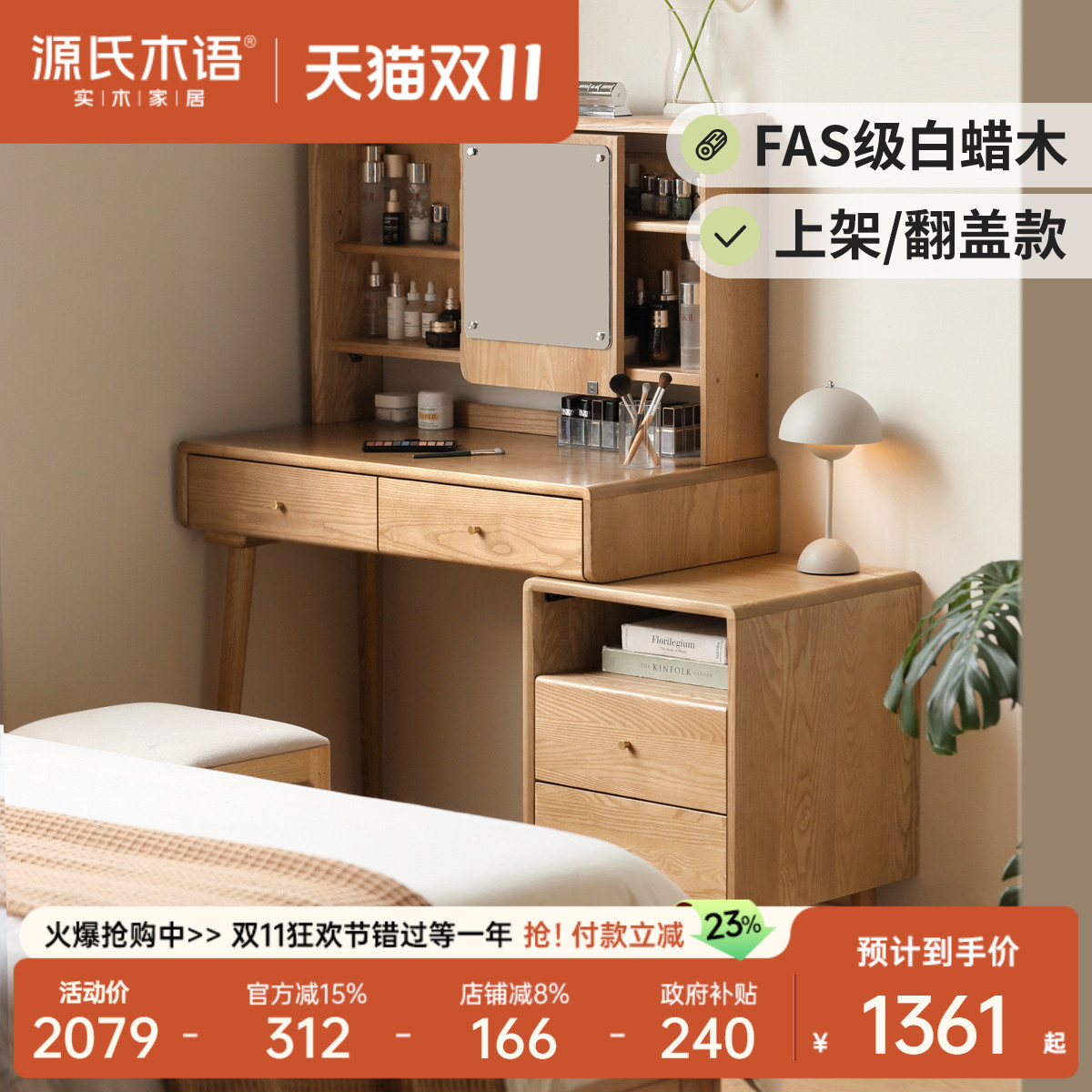 源氏木语实木化妆桌镜子遮挡简约梳妆台卧室收纳柜一体原木化妆台