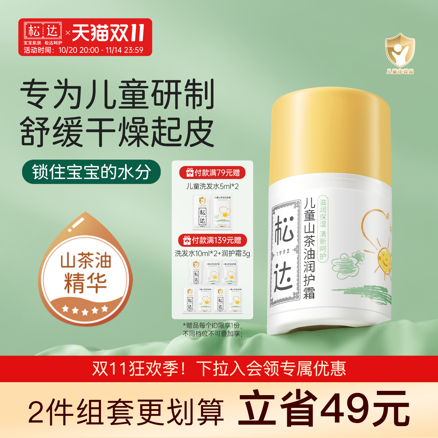 松达儿童山茶油面霜宝宝润护霜男女孩擦脸专用滋润肤四季舒缓保湿