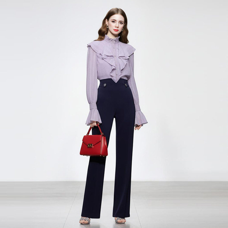 2026春装新款气质减龄荷叶边灯笼袖上衣钻扣高腰微喇修身长裤套装