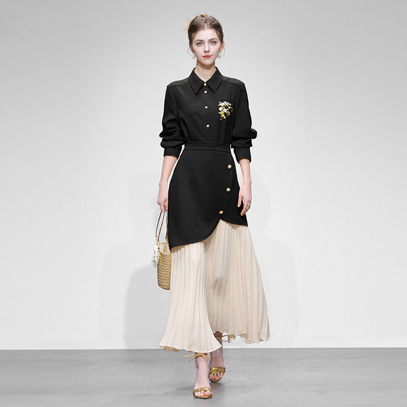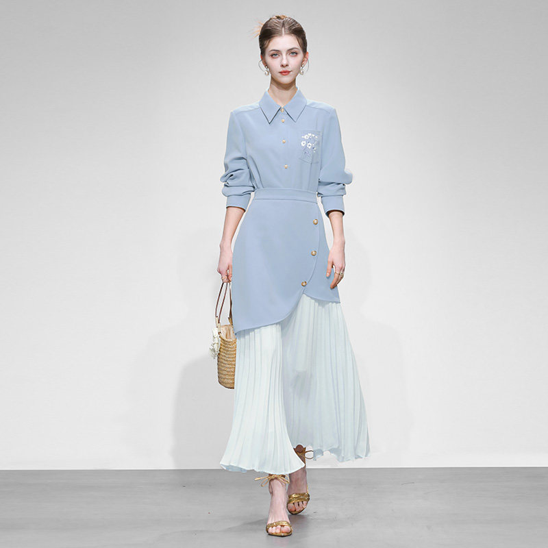 QC春装2024新款女装气质两件套蓝色衬衫上衣百褶裙长裙裙子套装