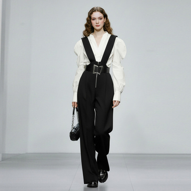春装女装2026新款气质廓形袖白色百搭衬衫高腰显瘦背带长裤套装