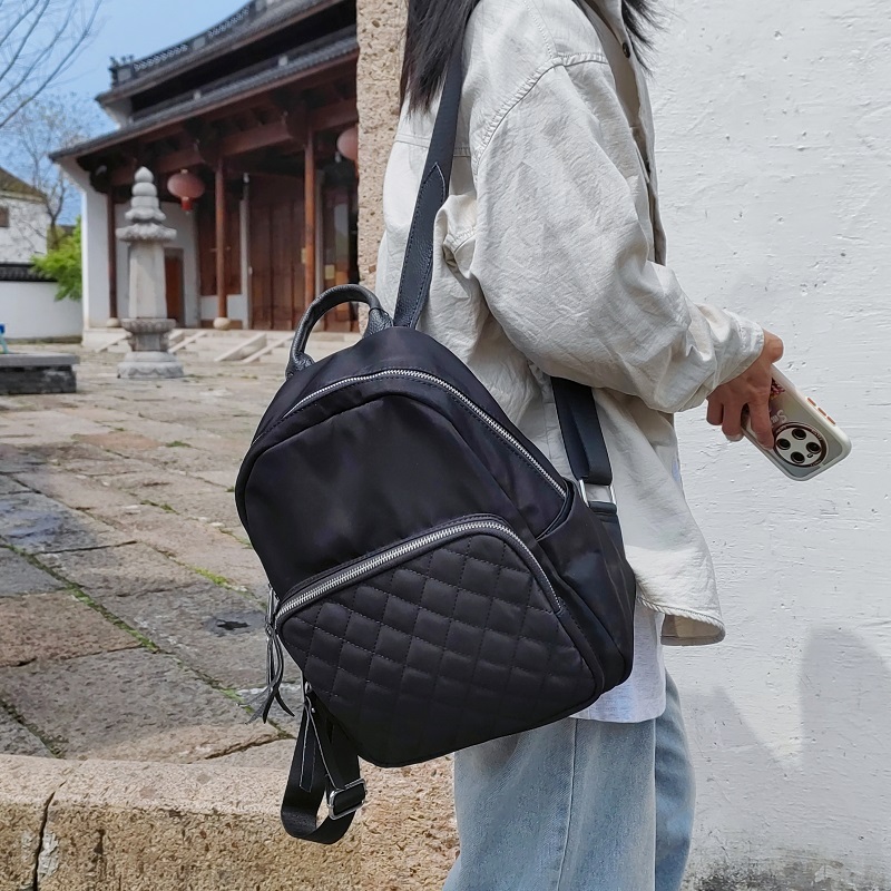 菱格防水尼龙配真皮双肩包女休闲黑色牛津布小背包简约新款迷你包
