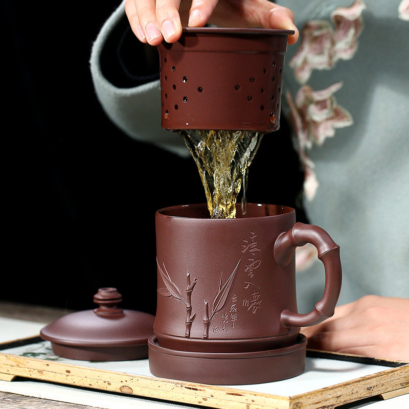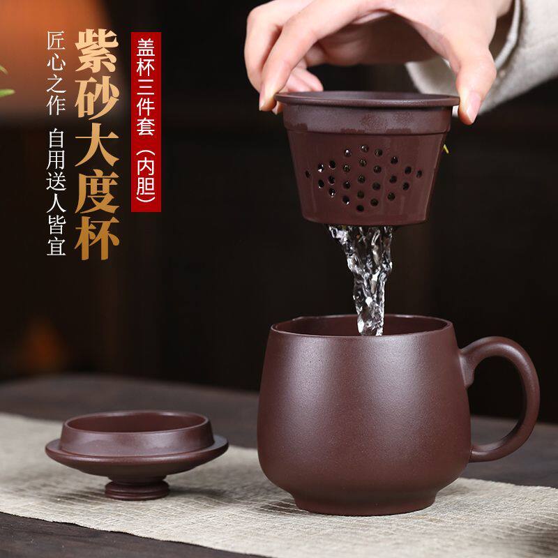 紫砂杯宜兴 原矿紫泥手工带盖过滤内胆三件套 办公茶具茶水分离
