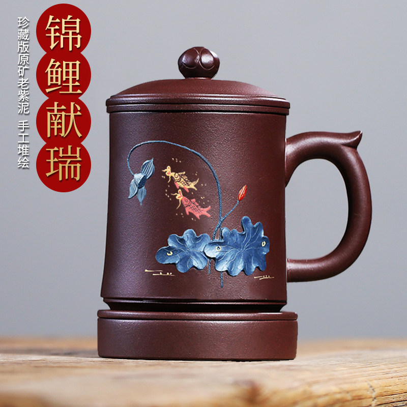 宜兴原矿紫砂杯茶杯鱼化龙家用带盖子过滤泡茶杯手工办公室盖杯单