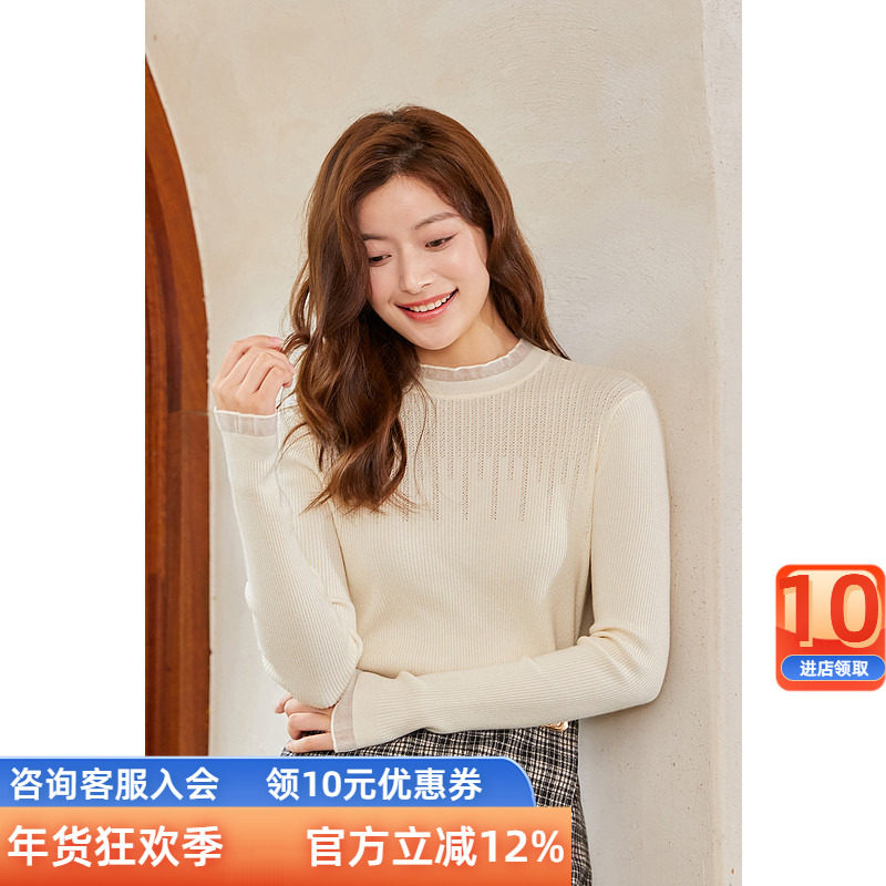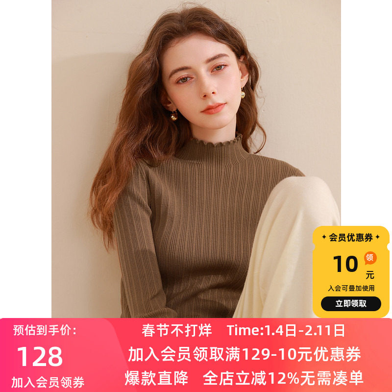 三彩2024冬季新款纯色坑条针织衫木耳边半高领修身打底内搭简约女