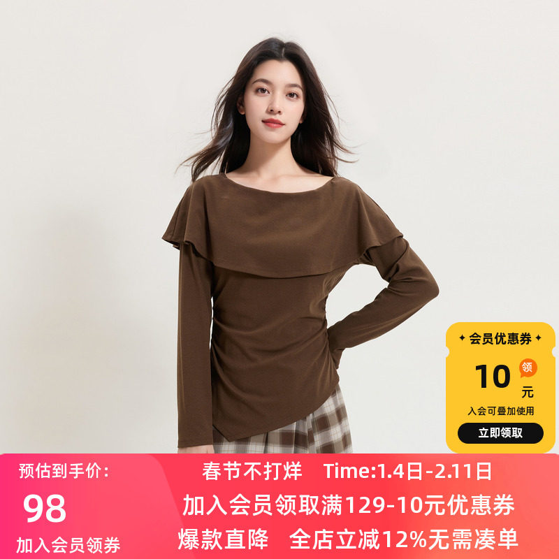 若潮大码女装2025冬季新款法式纯色一字领T恤修身长袖胖MM