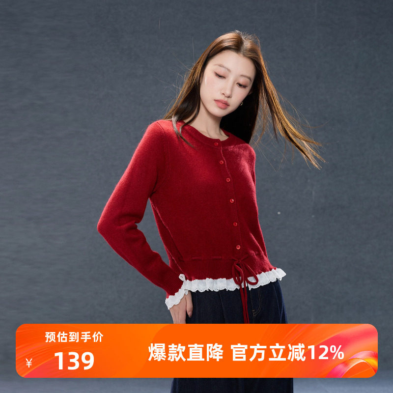 若潮大码女装2025冬季新款针织开衫毛衫撞色花边圆领甜俏胖MM
