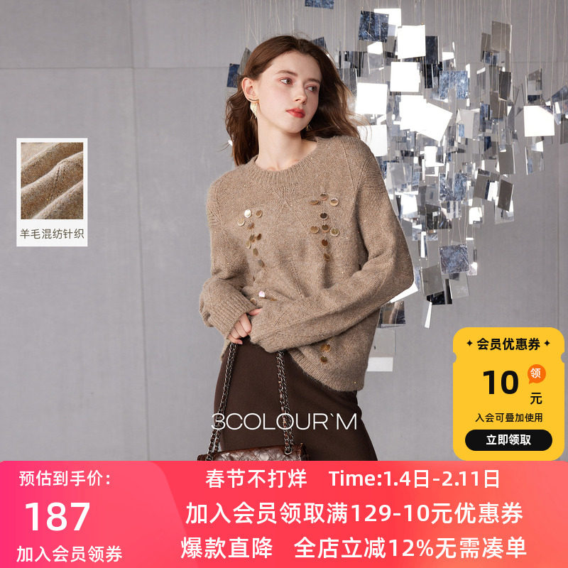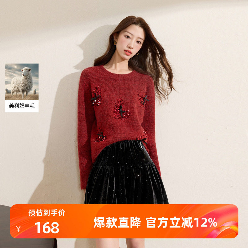 若潮大码女装2025冬季新款圆领针织衫毛衫套头珠片蝴蝶结胖MM