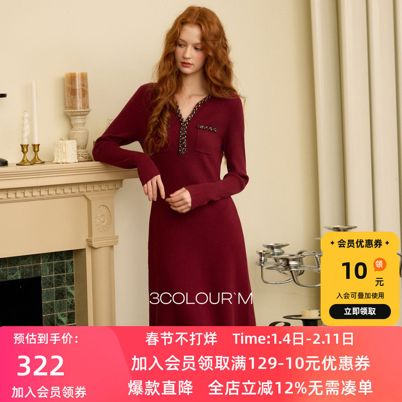 三彩2025冬季新款小香针织连衣裙V领气质收腰长裙长袖修身优雅M