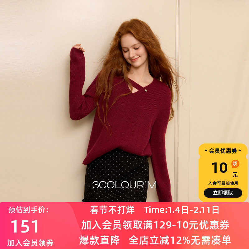 三彩2025冬季新款设计感V领针织衫亮丝毛衫套头宽松落肩休闲M