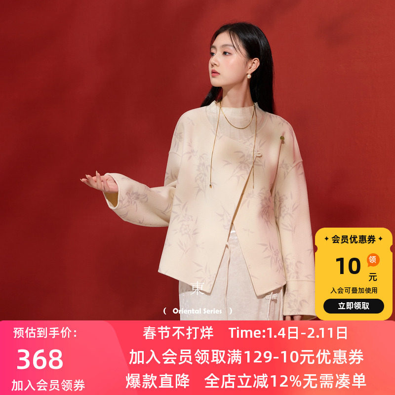 三彩【竹影流光】2025冬季新款绵羊毛印花双面呢大衣短款宽松C