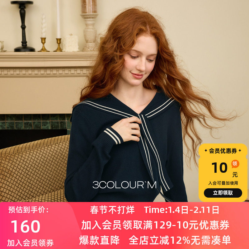 三彩2025冬季新款条纹海军领减龄针织衫套头毛衫休闲长袖设计感M