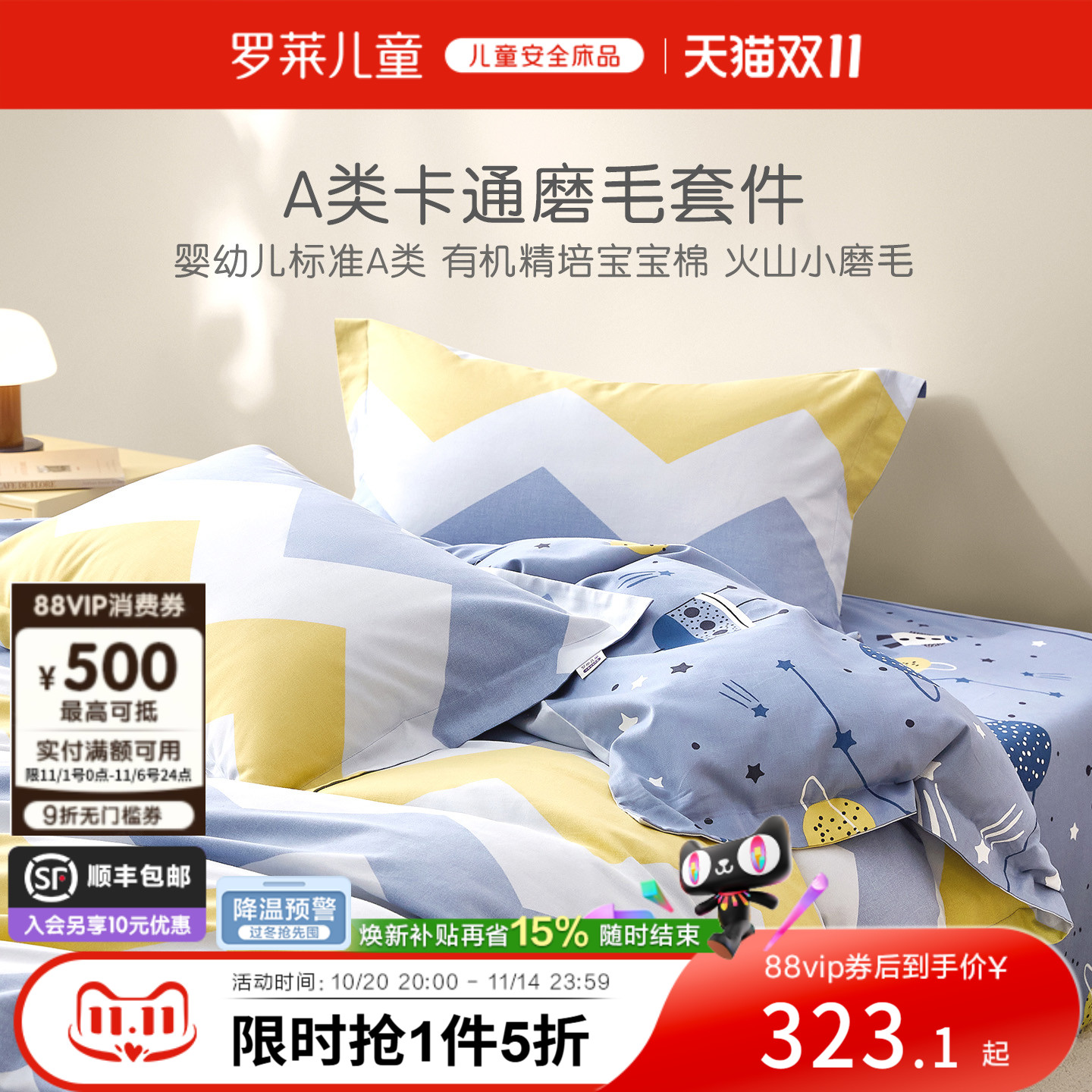 罗莱儿童秋冬卡通全棉纯棉加厚磨毛三件套被套被罩床笠床单四件套