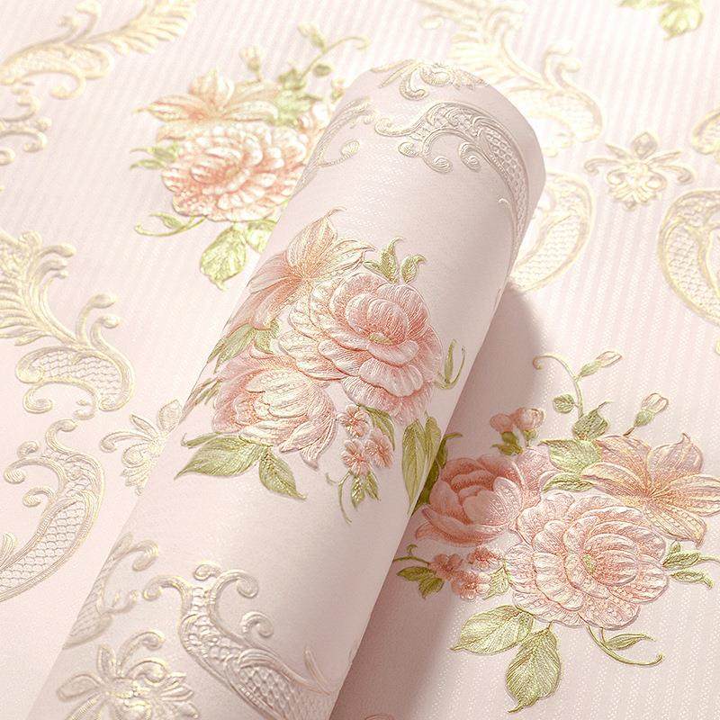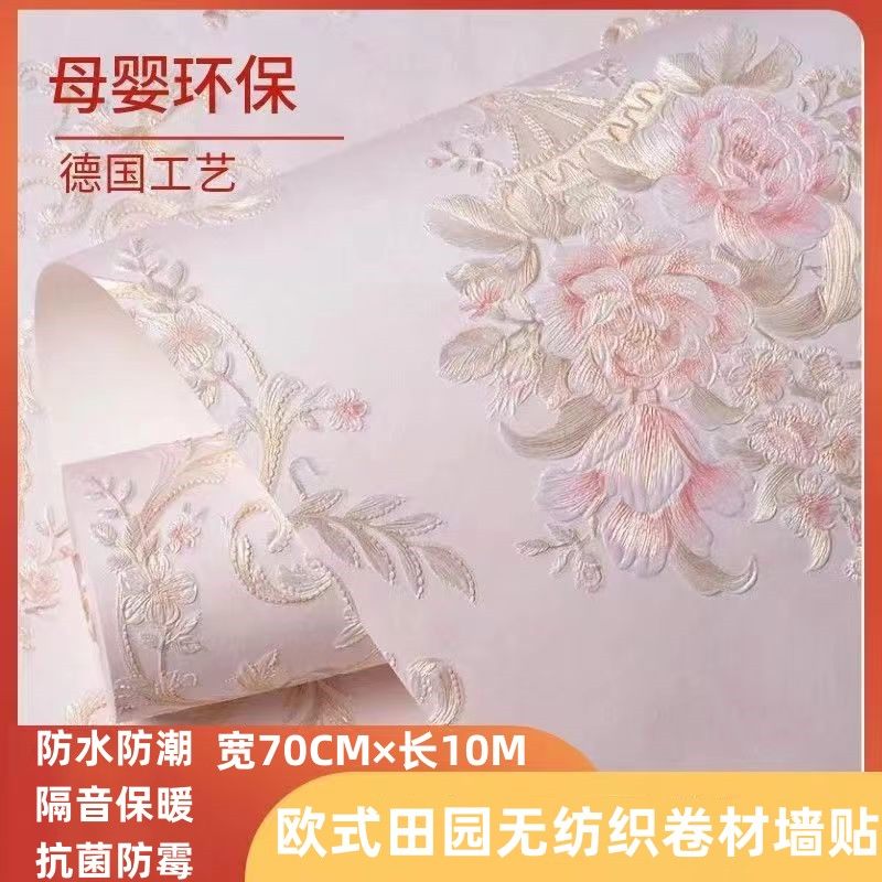 3d田园欧式花墙纸非自粘家用卧室房间立体浮雕无纺布粉色室内壁纸