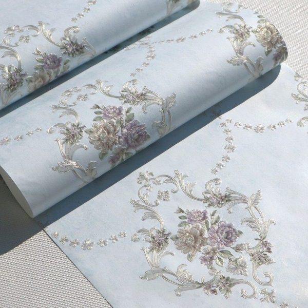 3D立体浅粉浅紫色欧式田园壁纸 复古浅绿色淡蓝色欧式宫廷花墙纸