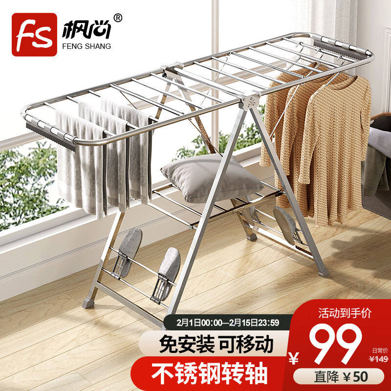 枫尚晾衣架落地晒衣架折叠挂衣架室内晾衣杆阳台晒被架不锈钢尿布