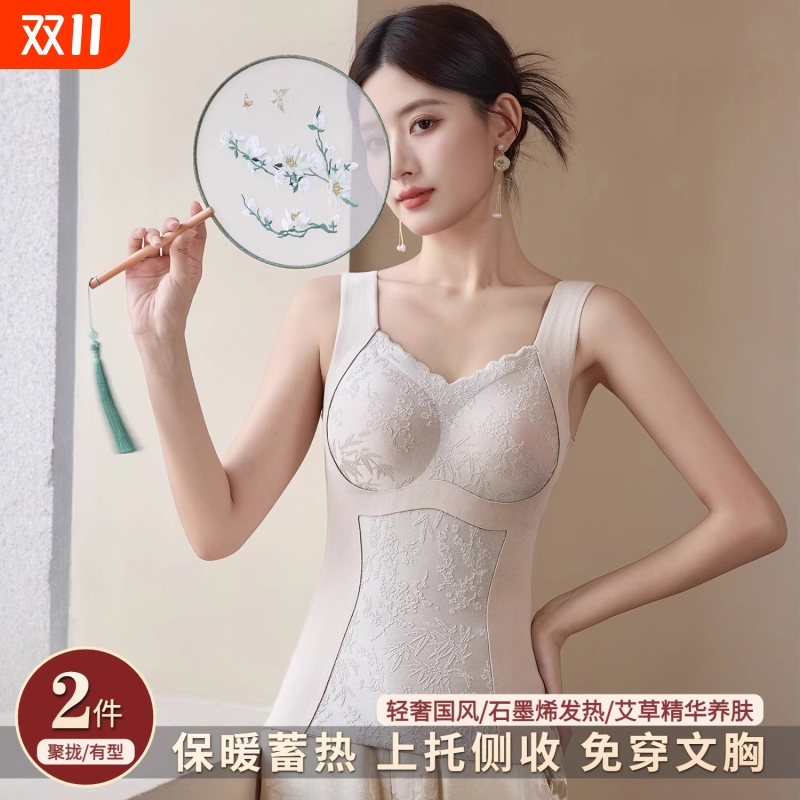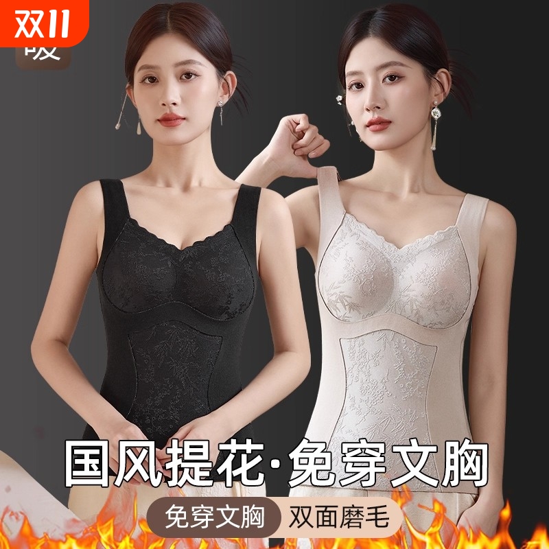 新中式浮雕提花加绒保暖背心女士自带胸垫内衣塑身聚拢打底秋衣女