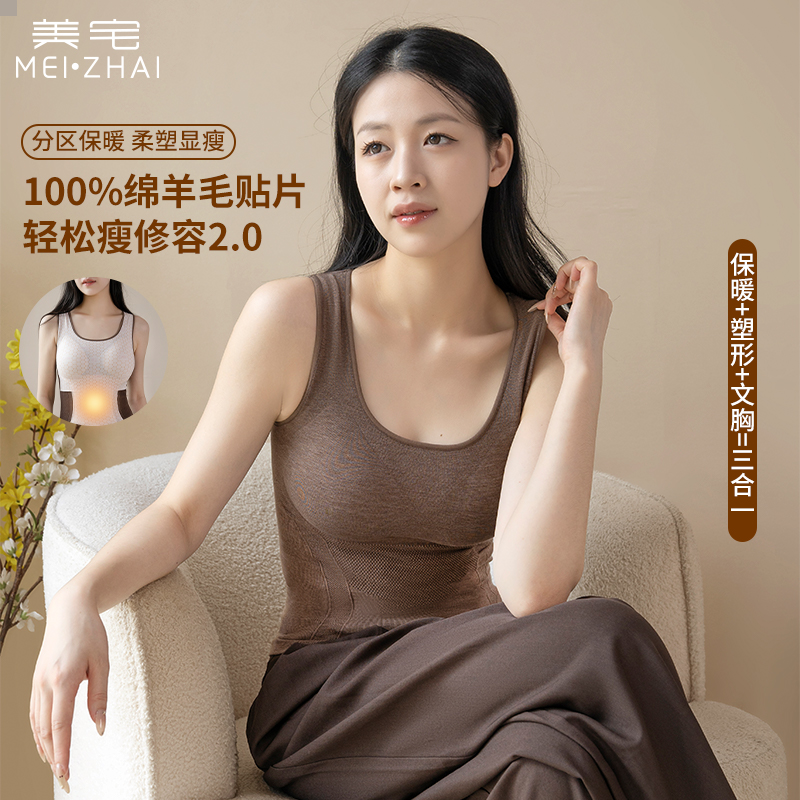 美宅羊毛无痕保暖背心女秋冬打底衫内衣带胸垫秋衣女内搭吊带上衣