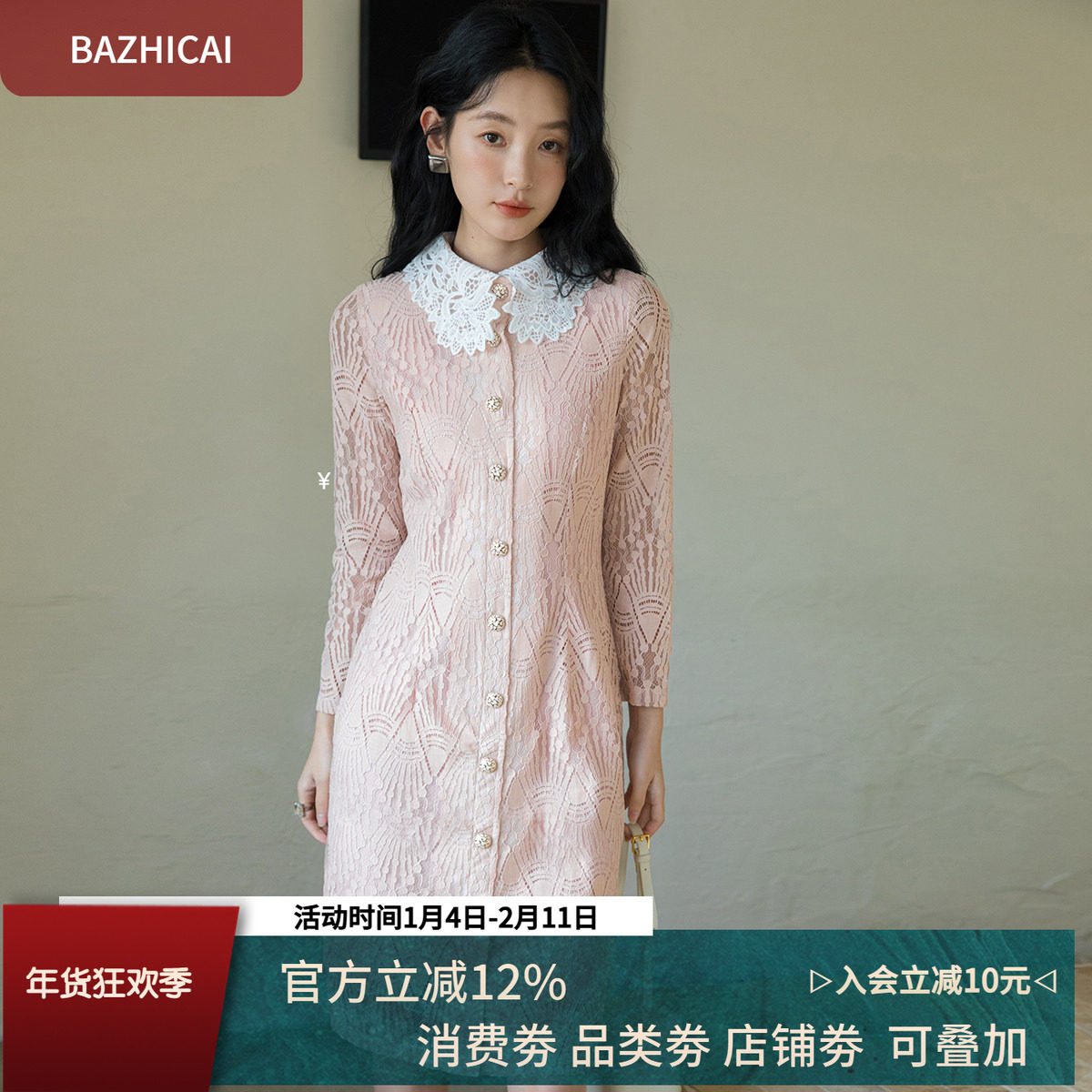 千金名媛粉色蕾丝小香风假两件连衣裙女新款修身温柔衬衫裙437