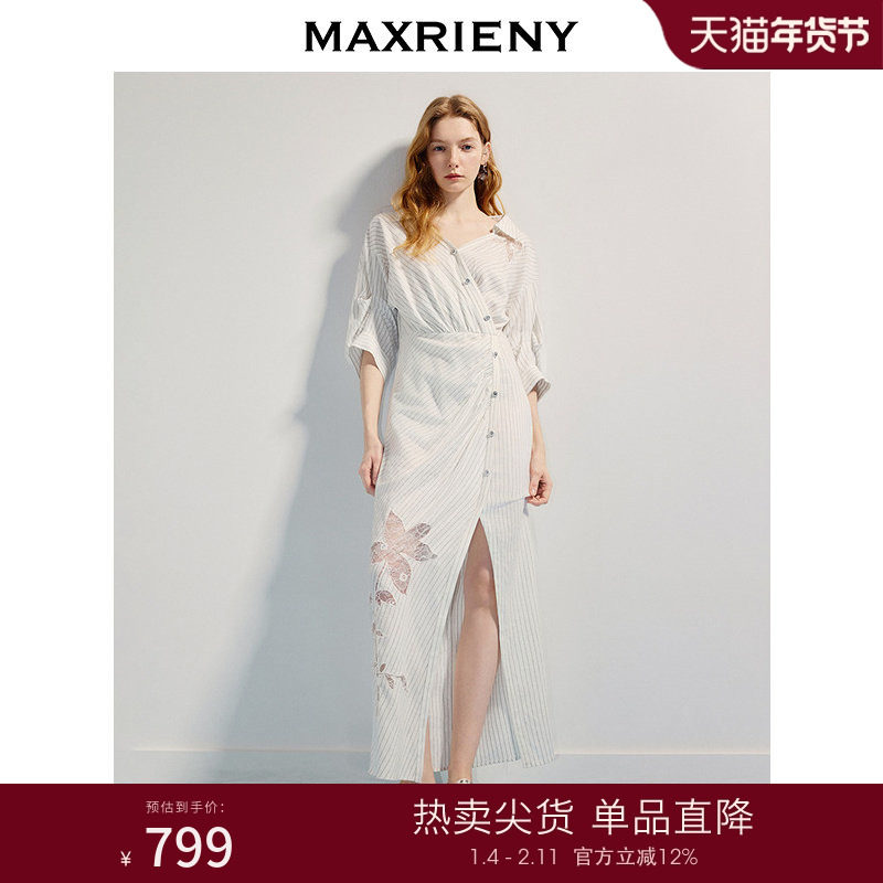 MAXRIENY黑白条纹修身收腰开叉连衣裙25夏款小众设计感气质衬衫裙