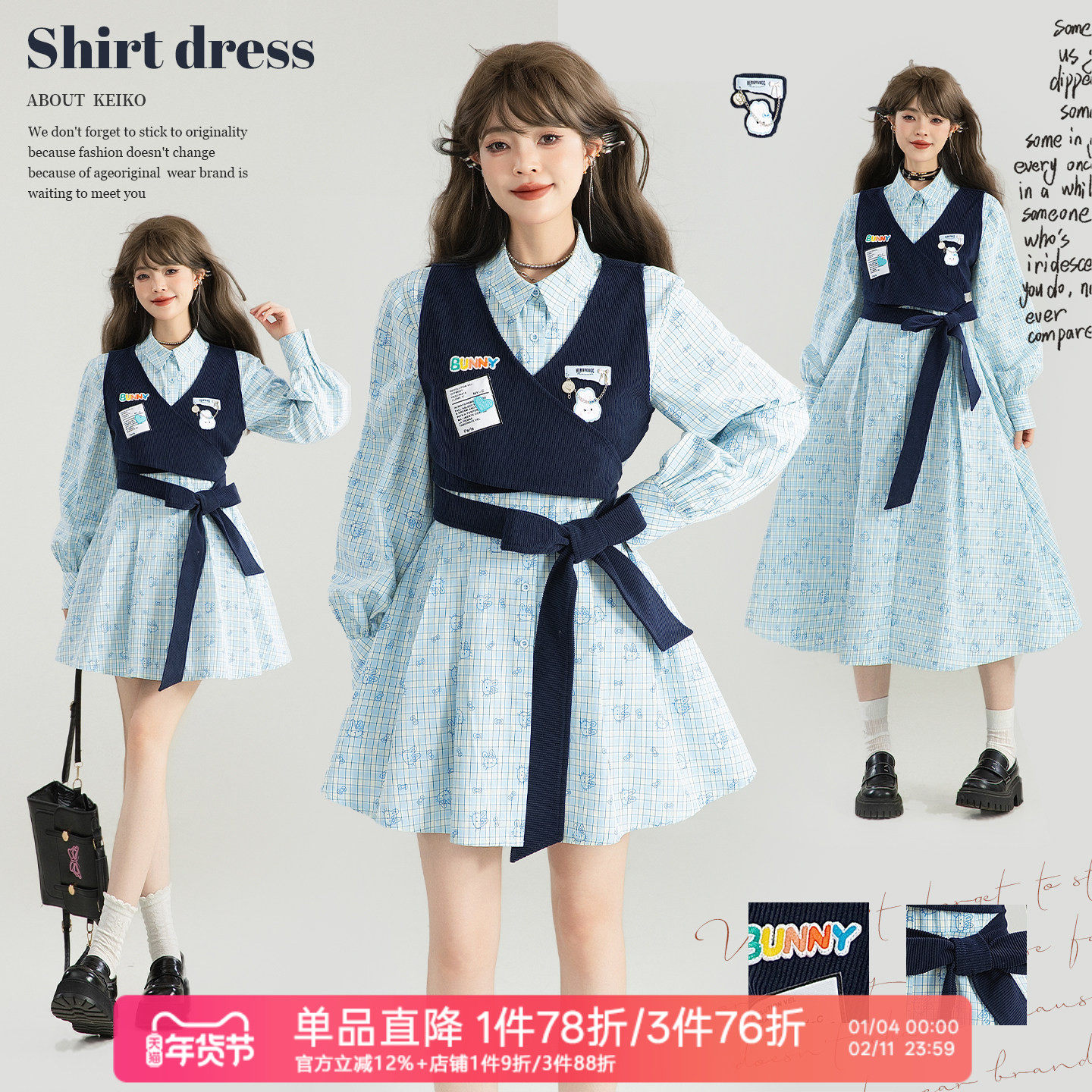 KEIKO 韩系高智感假两件式连衣裙26春季设计感系带收腰格纹衬衫裙