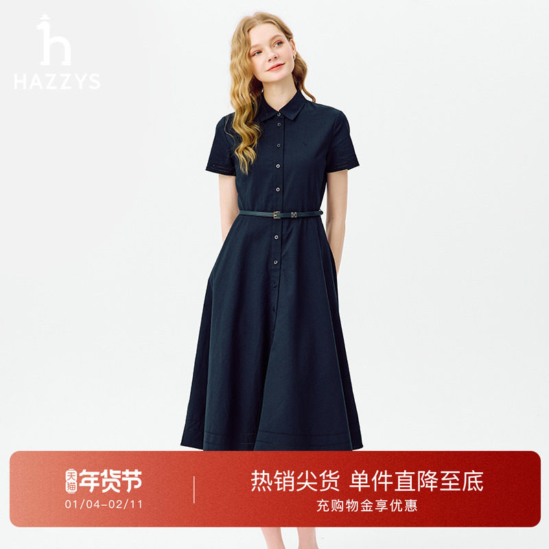 Hazzys哈吉斯收腰女士短袖连衣裙时尚翻领衬衫裙休闲通勤中长裙