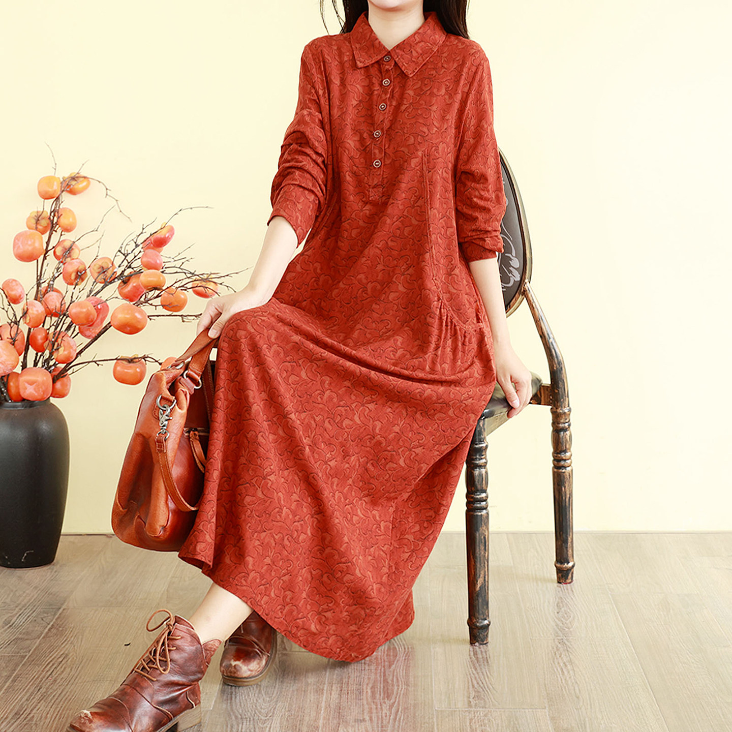 复古文艺棉料连衣裙女秋季长款印花过膝长裙子长袖宽松打底衬衫裙