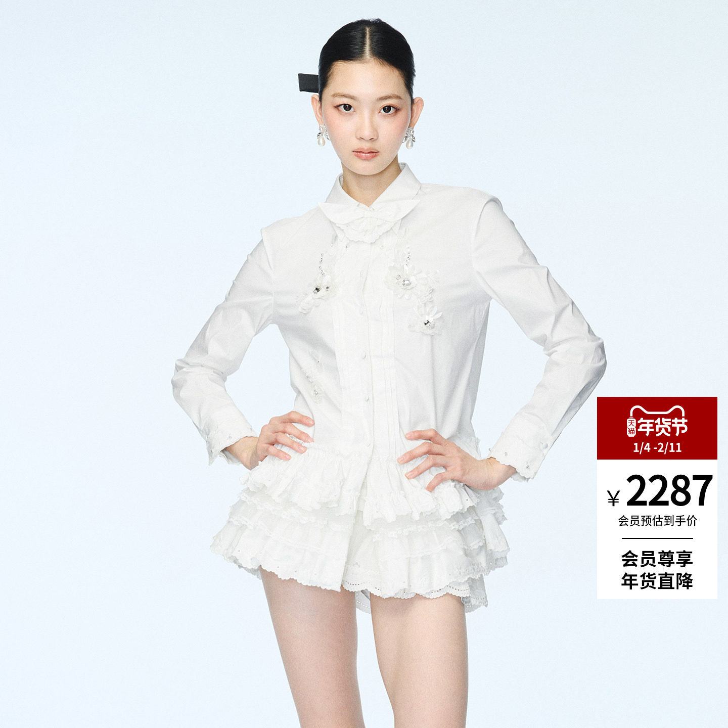 lefame拉飞姆2025秋冬新款时尚白色花朵珠饰蛋糕花边衬衫裙连衣裙