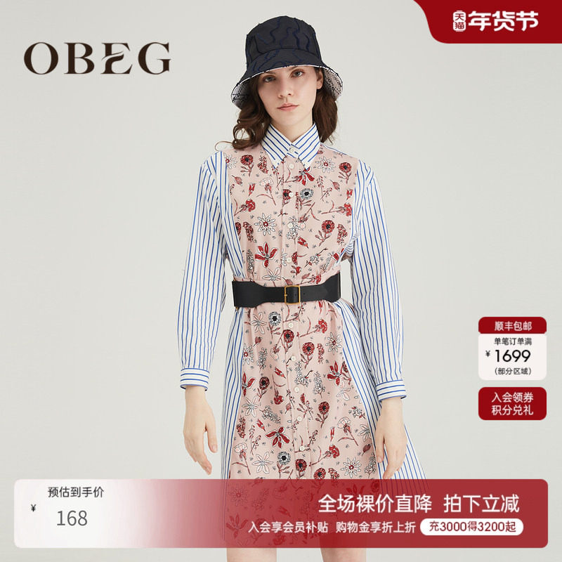 OBEG欧碧倩夏拼接碎花连衣裙长袖条纹收腰衬衫裙10421091