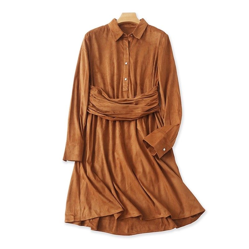 外贸麂皮绒翻领连衣裙 春秋新收腰修身中长款女长袖衬衫裙子23304
