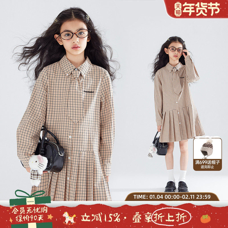 senbaby童装女童加厚衬衫裙2025冬季儿童保暖长袖格子衬衫棉袄裙