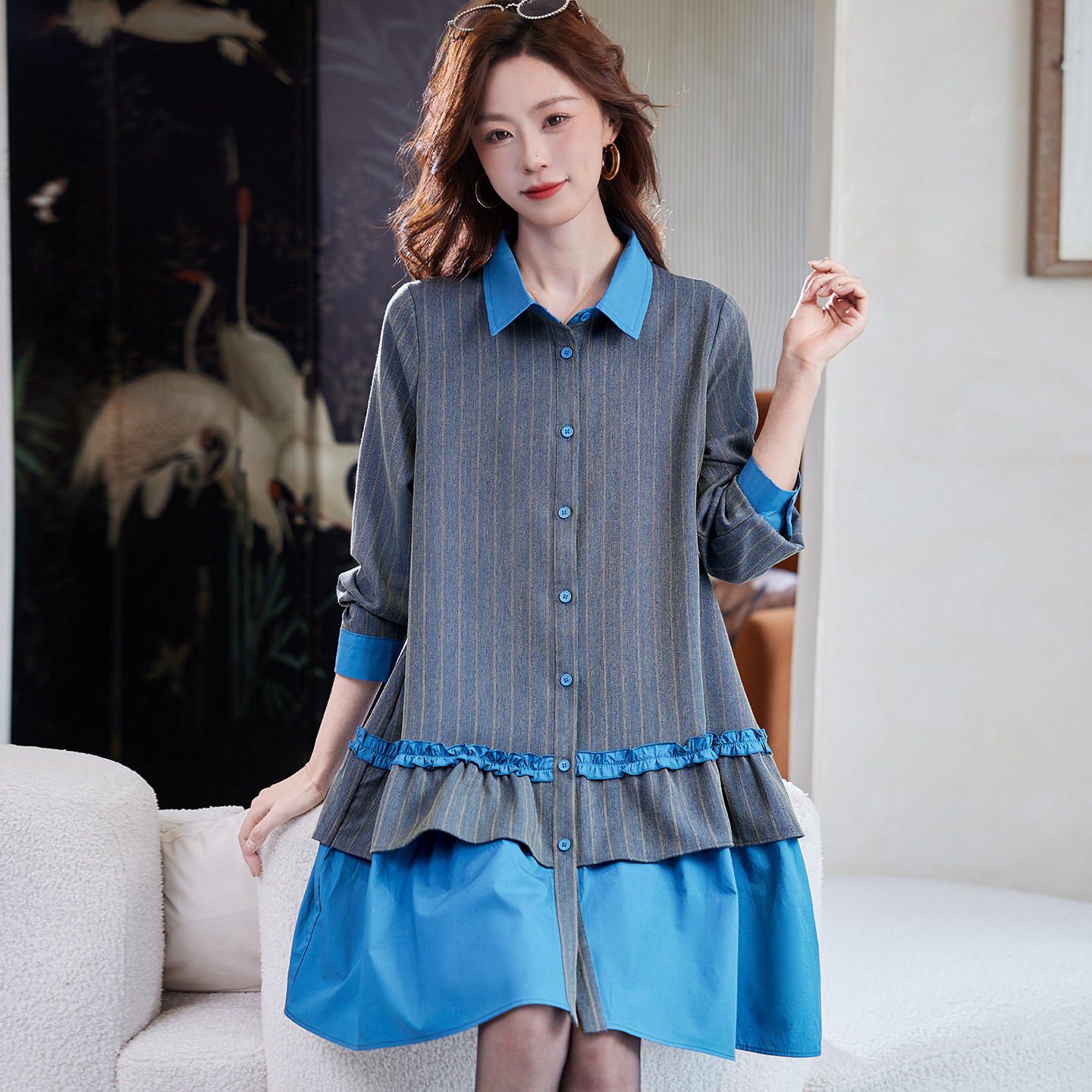 dfvc设计感纯棉长袖衬衫裙女2025年夏季新款不对称蕾丝拼接连衣裙