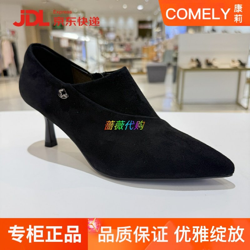 康莉女鞋尖头细跟高跟鞋侧拉链2025秋款新款女黑色深口鞋KYQ56523