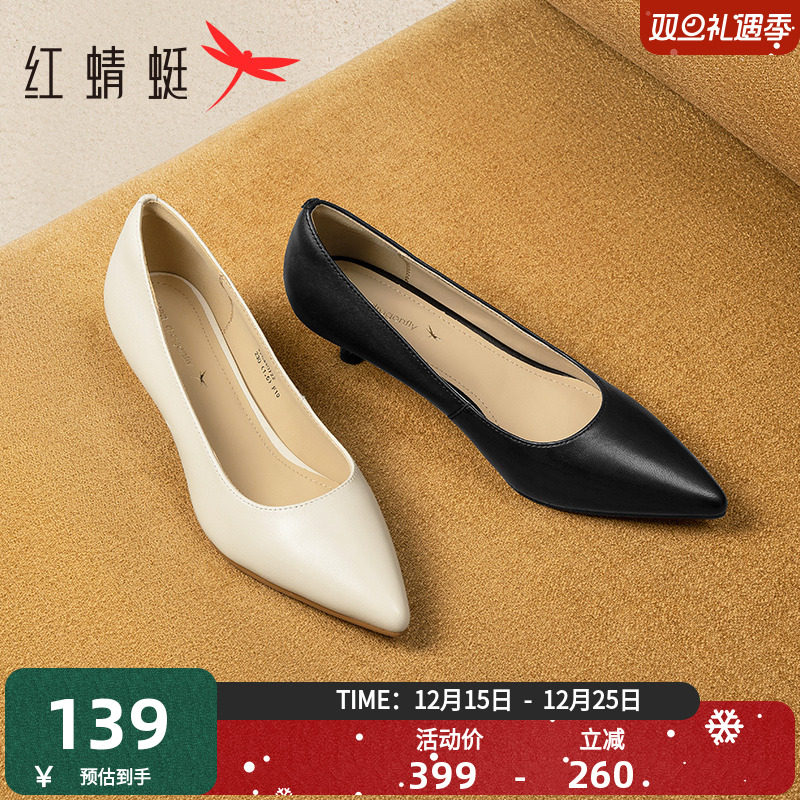 红蜻蜓黑色面试高跟鞋女春秋款细跟女鞋皮鞋法式尖头超软羊皮单鞋