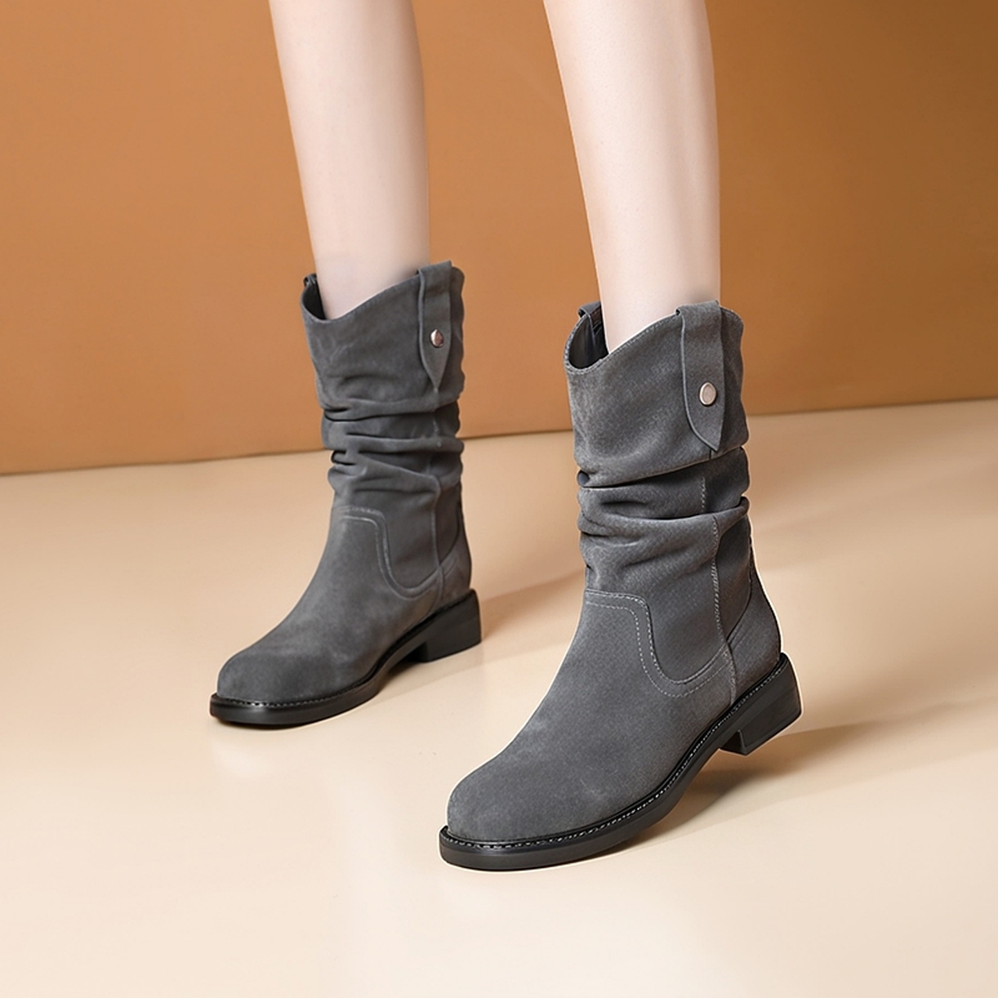 断码处理磨砂真皮平底堆堆靴女秋冬新款内增高尖头短靴西部牛仔靴