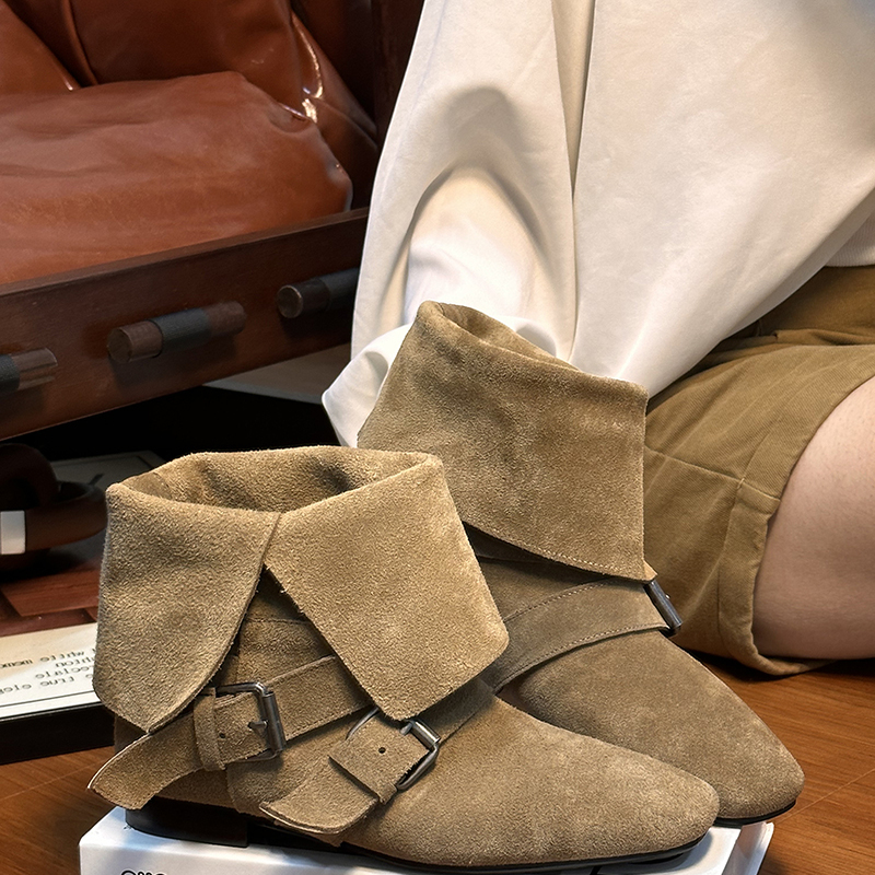 磨砂真皮小众辣妹西部牛仔短靴女2025秋冬新款平底翻领两穿马丁靴