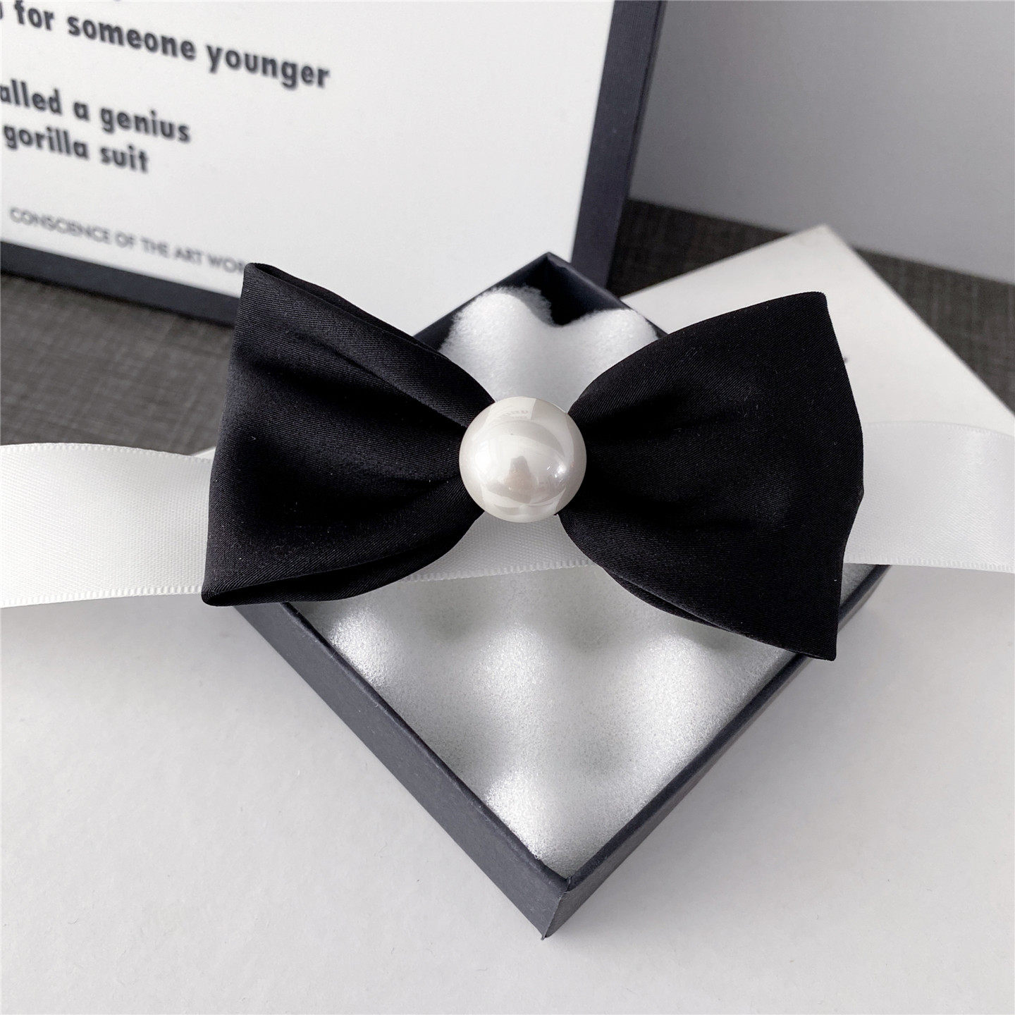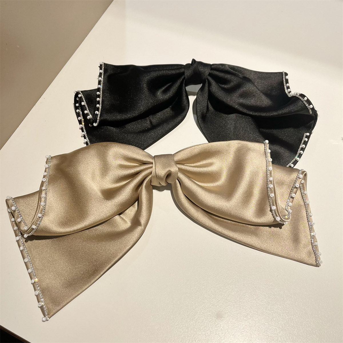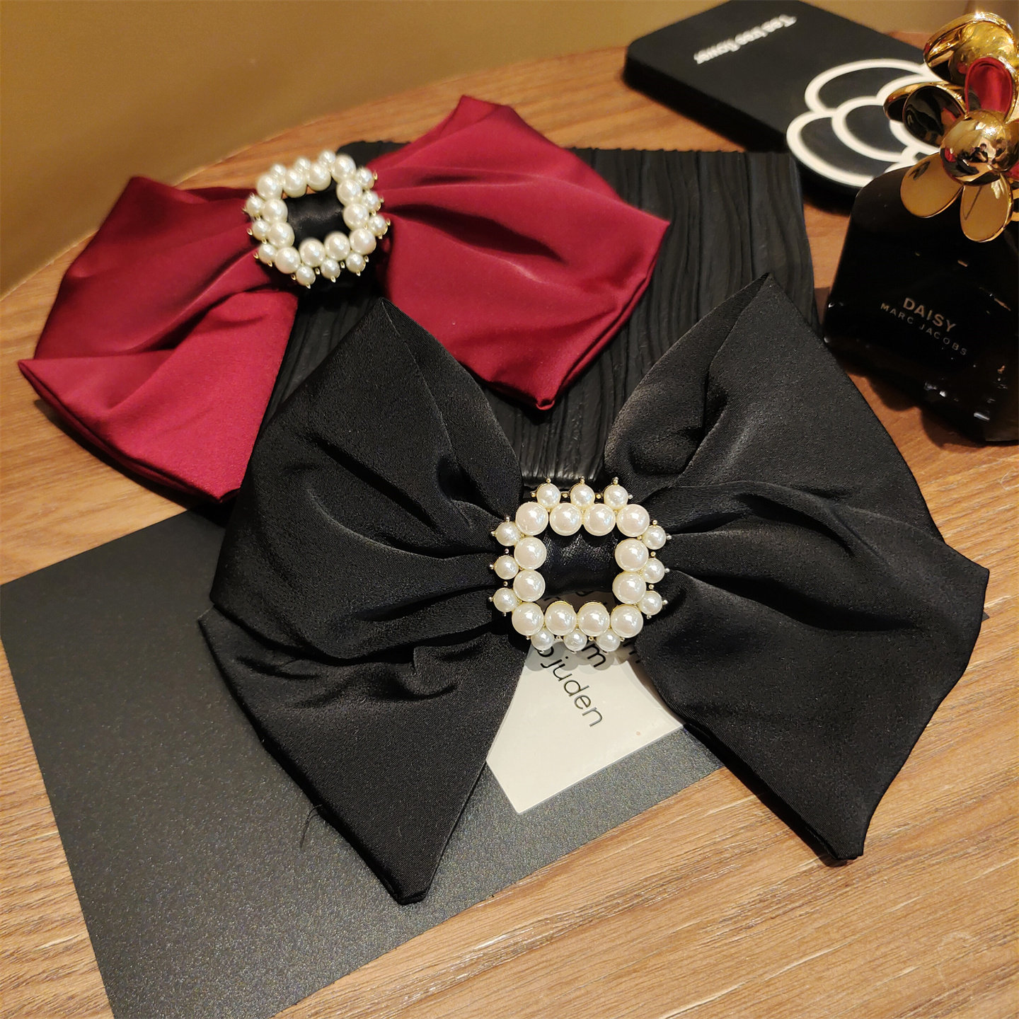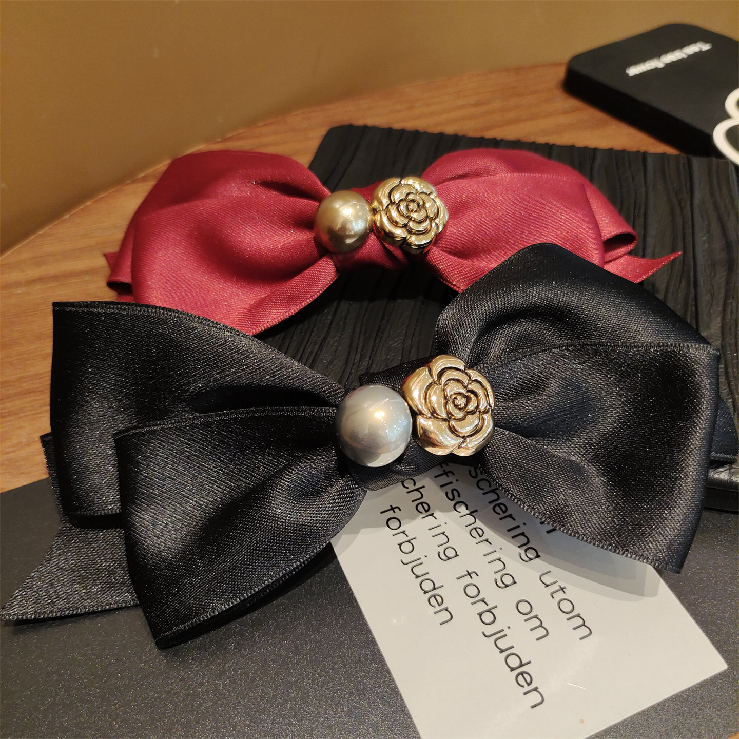黑色蝴蝶结发夹复古时尚珍珠缎面布艺顶夹弹簧夹发饰半夹头饰简约