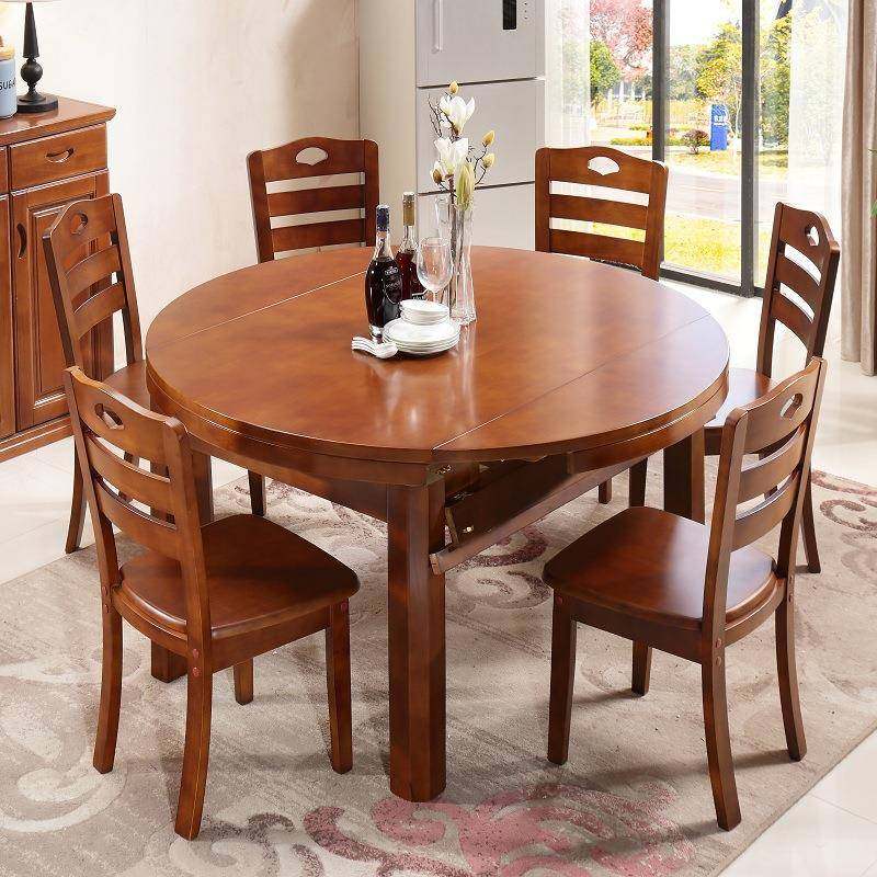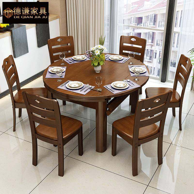 实木餐桌椅组合4人6人伸缩折叠家用简约中式圆饭桌子橡胶木小户型