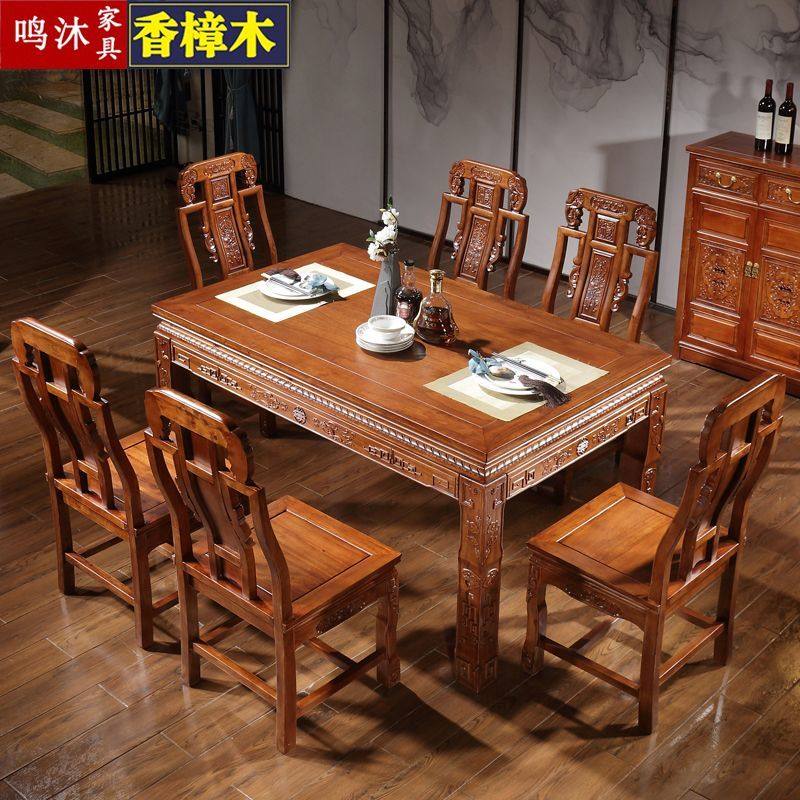 香樟木实木餐桌椅组合长方形4_6人饭桌现代中式家用小户型西餐桌