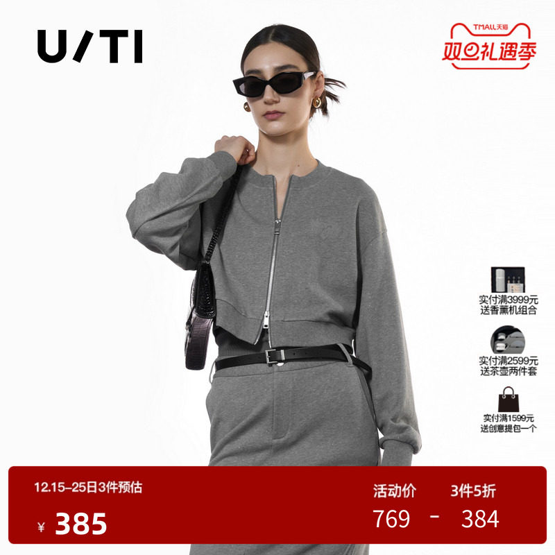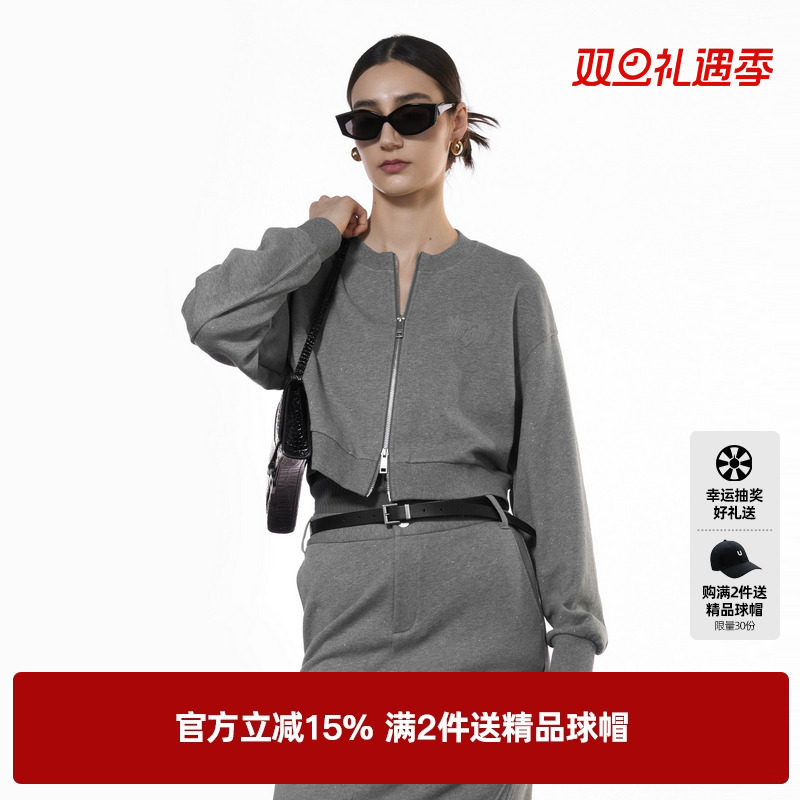 U/TI双拉链闪粉卫衣女简约正肩短款毛圈休闲上衣尤缇2025秋季新款