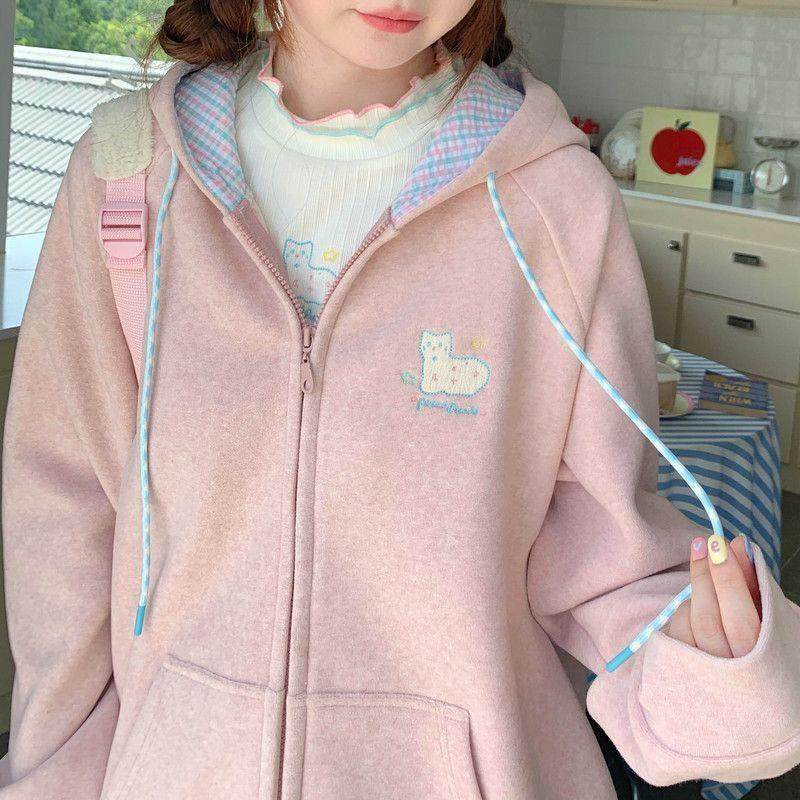【纯棉不起球】学院风开衫粉卫衣女秋冬甜美少女加绒宽松连帽外套