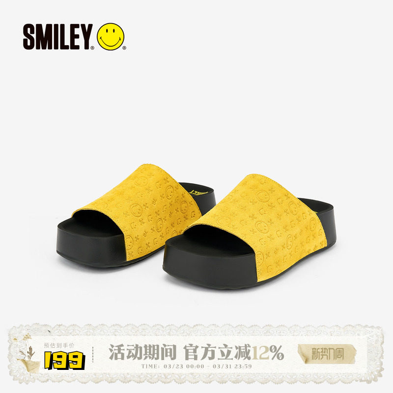 SMILEY笑脸老花懒人拖鞋女黄色新款夏季一字拖鞋潮流厚底增高舒适